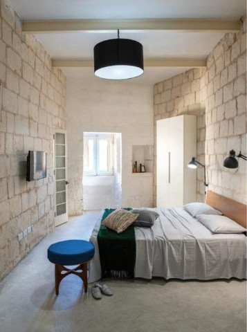 Inside, original walls are teamed with concrete floors for a pared back feel, the use of concrete linking the interior with the exterior façade. Where possible, materials were recycled including old doors and stones. ‘We found an old layer of patterned tiles under the existing floor and these were carefully removed and cleaned, and these together with plain tiles found from three other different sites in the property were cleaned and laid by yours truly to fill gaps in the floor where openings were widened or walls removed,’ says the homeowner. ‘Steel frames from the old beds were used to create part of the roll out staircase to the mezzanine and wood from an old table was used for the threads on the access ladder too.’
